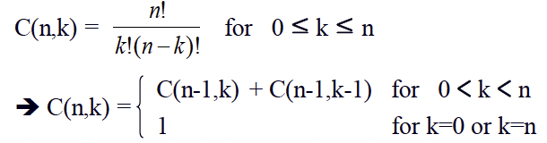 // Iterative way (Dynamic programming) public static int binDP (int n, int k) { index i, j; int[][] B = new int[0..n][0..k]; for (i=0; i<=n; i++) for (j=0; j <= min(i, k); j++) if (j==0 || j==i) B[i][j] = 1; else B[i][j] = B[i-1][j-1] + B[i-1][j]; return B[n][k]; } // Recursive way (Divide and conquer) public static int binDC (int n, int k) { if (k==0 || k==n) return 1; return binDC(n-1. k-1) + binDC(n-1, k); }dp를 이용한 방법은 2차원 배열을 이용한 Bottom-up 방식을 사용하여 계산한 것이다.