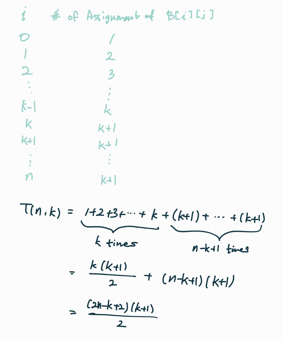 또한, j <= min(i, k)를 반복문에서 사용하여 배열의 값을 계산하는 범위를