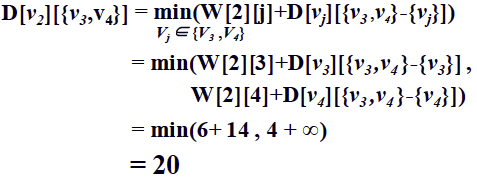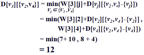 min(W[1][j] + D[vj][V-{v1, vj}]) (j: 2~n)로 구할 수 있다.