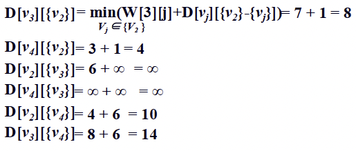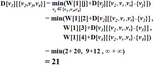 이를 일반화하여 D[vi][A] = min(W[i][j] + D[vj][A-{vj}]) (vj: A의 원소)라는 관계를 얻을 수 있다.