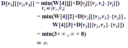 - D[vi][A]: vi 에서 A의 모든 vertices를 지나 v1로 돌아오는 최단 경로의 길이