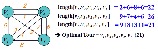 위 예시에서는 v1 - v3 - v4 - v2 - v1로 방문하면 최단 시간이 걸린다.