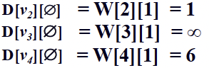 - D[vi][∅]: vi 에서 아무런 vertex를 지나지 않고 v1로 돌아오는 최단 경로의 길이