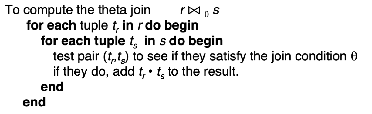 2중 반복문을 돌면서 조건을 검사하고 조건에 맞는 tuple를 결과에 추가하는 join 연산.