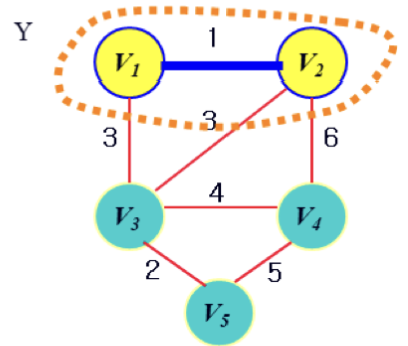 - 찾은 edge 중, weight가 가장 작은 edge에 연결된 vertex를 Y에 추가한다.