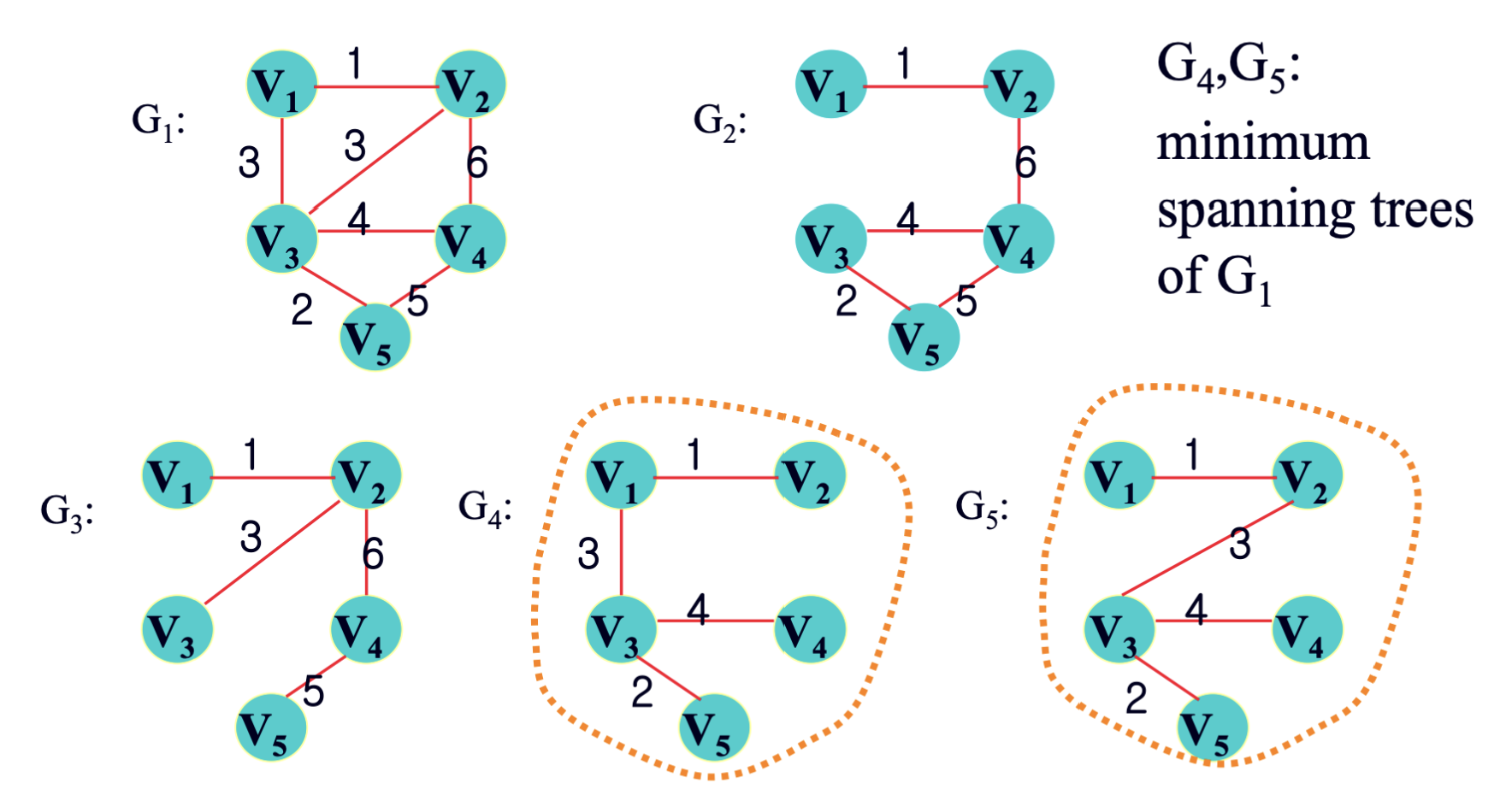 G1이 오리지널 트리라 했을 때, G4, G5만이 G1의 Minimum Spanning Tree이다.