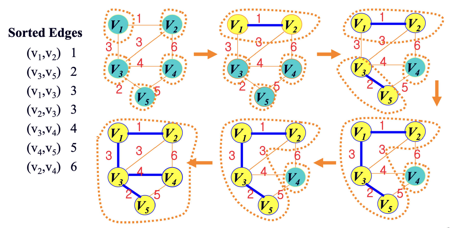 - weight가 가장 작은 edge로 연결된 부분집합을 merge한다.