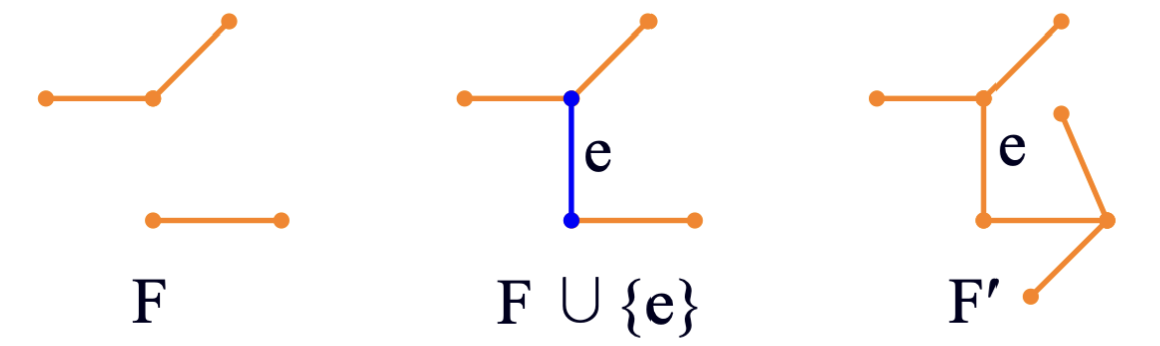 (여기서 e는 F에 포함되지 않으며, F union {e}가 cycle이 없도록 하는 edge 중 weight가 가장 작은 edge)