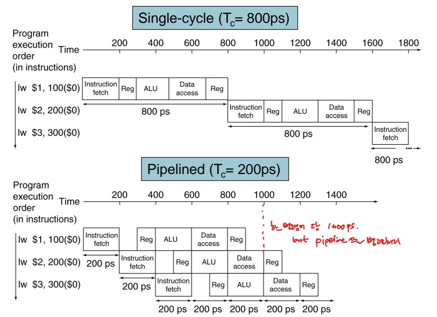 파이프라인 기법을 쓰기 위해서는 모든 단계의 시간을 가장 오래 걸리는 단계의 시간으로 맞춰줄 필요가 있기 때문이다.