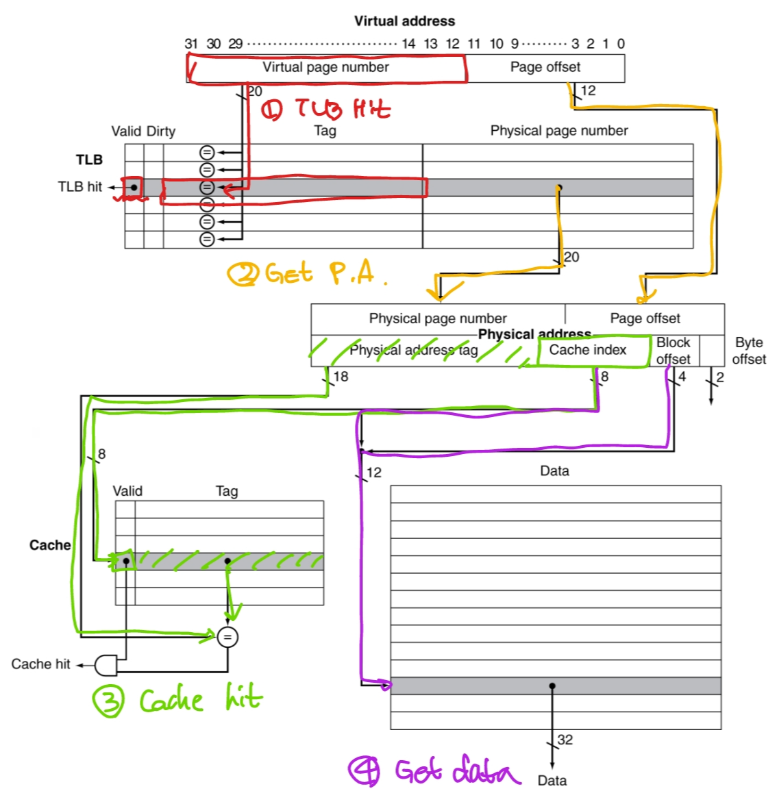 - TLB = hit, 캐싱되어 있다면 physical page number를 알아내서 physical address를 얻는다.