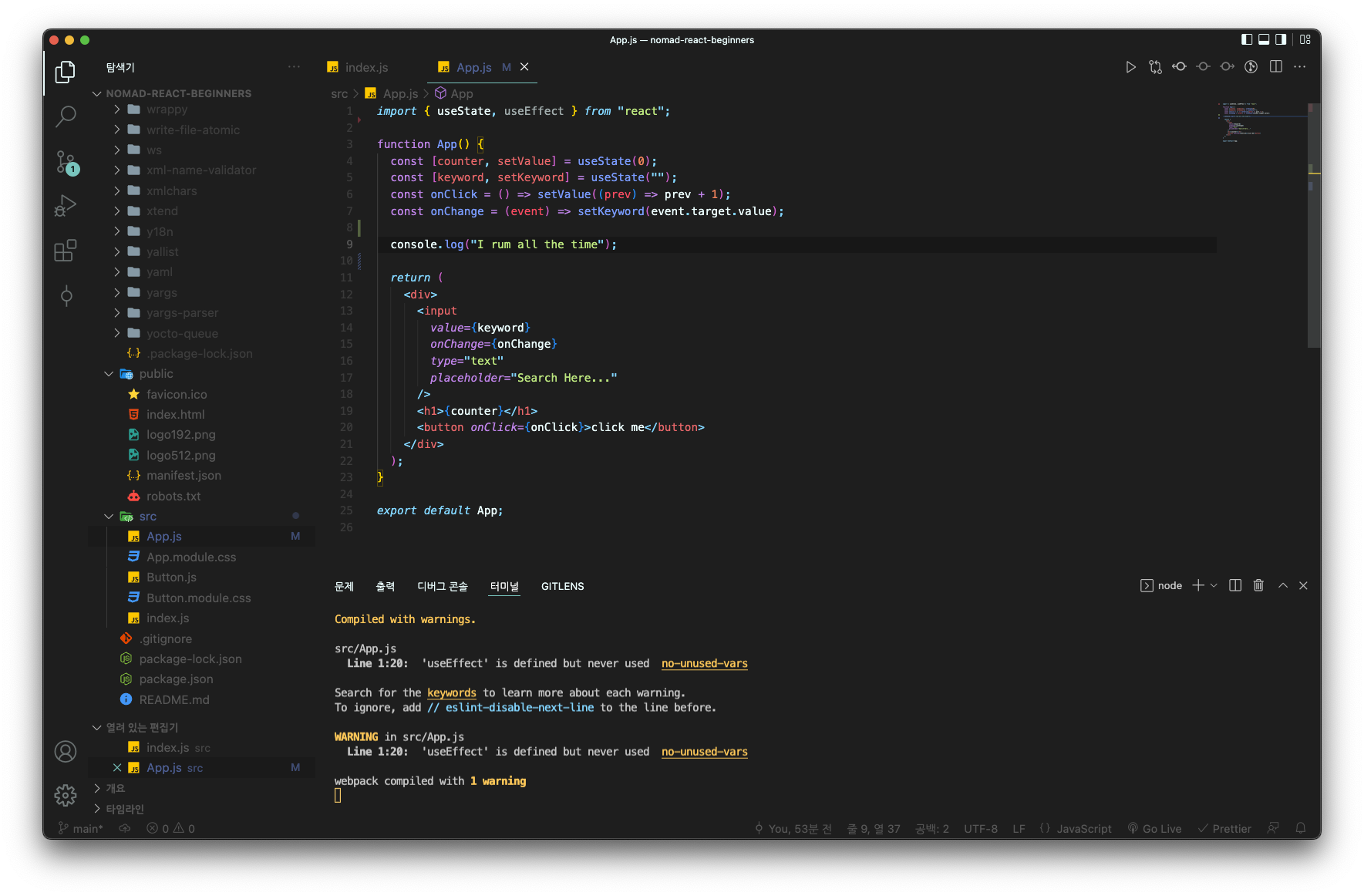 실제로 input에 글자를 치기만 하는데도 <Fig. 1> Line. 9의 console.log가 계속해서 찍히는 것을 확인할 수 있다.