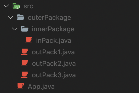 // inPack.java package outerPackage.innerPackage; public class inPack { String s; protected String ps; public inPack() { s = "inPack"; } public void print() { System.out.println("inPack: " + s); } protected void protPrint() { System.out.println(ps); } }// outPack1.java package outerPackage; public class outPack1 { String s; outPack1() { s = "outPack1"; } void print() { System.out.println("outPack1: " + s); } protected void protPrint() { System.out.println("Protected method from outPack1"); } }// outPack2.java package outerPackage; import outerPackage.innerPackage.inPack; public class outPack2 { String s; public outPack2() { outPack1 op1 = new outPack1(); s = op1.s + " add 2 @ outPack2"; op1.print(); op1.protPrint(); } public void print() { System.out.println("outPack2: " + s); inPack ip = new inPack(); ip.print(); // ip.protPrint(); } }// outPack3.java package outerPackage; import outerPackage.innerPackage.inPack; public class outPack3 extends inPack { String s; public outPack3() { s = "outPack3"; // this.s ps = "protected String"; // super.ps } public void print() { inPack ip = new inPack(); ip.print(); // ip.protPrint(); super.protPrint(); } }// App.java import outerPackage.*; import outerPackage.innerPackage.*; public class App { public static void main(String[] args) { // outPack1 op1 = new outPack1(); outPack2 op2 = new outPack2(); outPack3 op3 = new outPack3(); inPack ip = new inPack(); op2.print(); op3.print(); ip.print(); } } 실행 결과 outPack1: outPack1 Protected method from outPack1 outPack2: outPack1 add 2 @ outPack2 inPack: inPack inPack: inPack protected String inPack: inPackjava는 파일 시스템을 이용해서 패키지를 관리한다.
