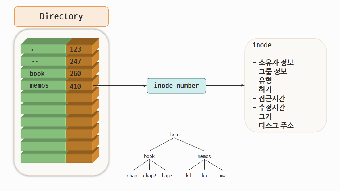 각 엔트리는 디렉토리에 포함되어 있는 파일이나 디렉토리의 inode 번호, 이름을 저장하는 문자 필드 등으로 구성된다.