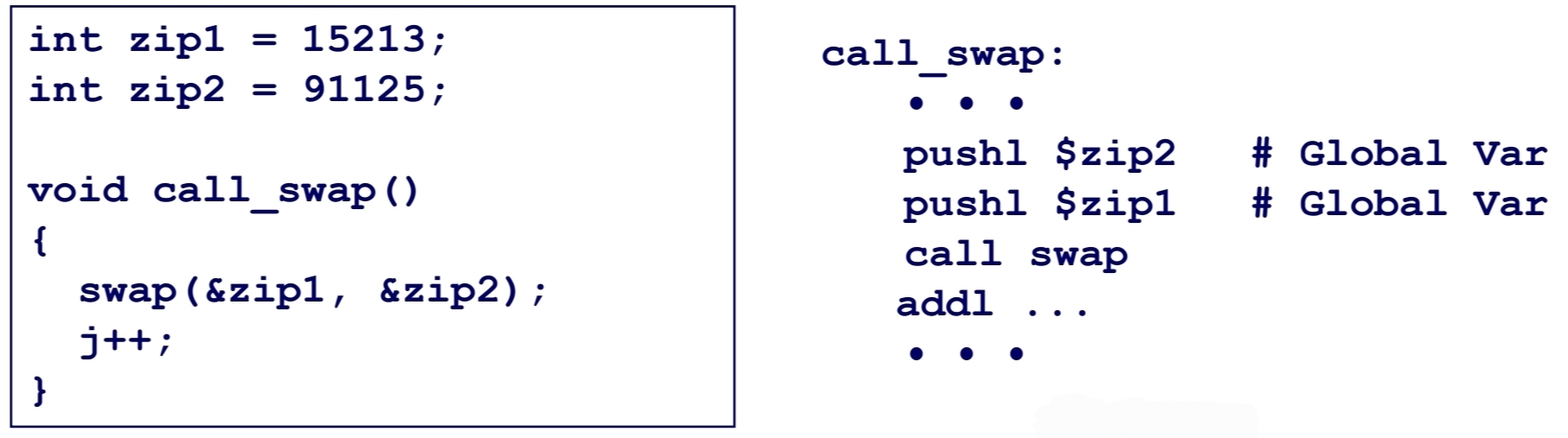 왼쪽이 c 코드이고, 오른쪽은 스택 프레임에 저장된 c 코드이다.
