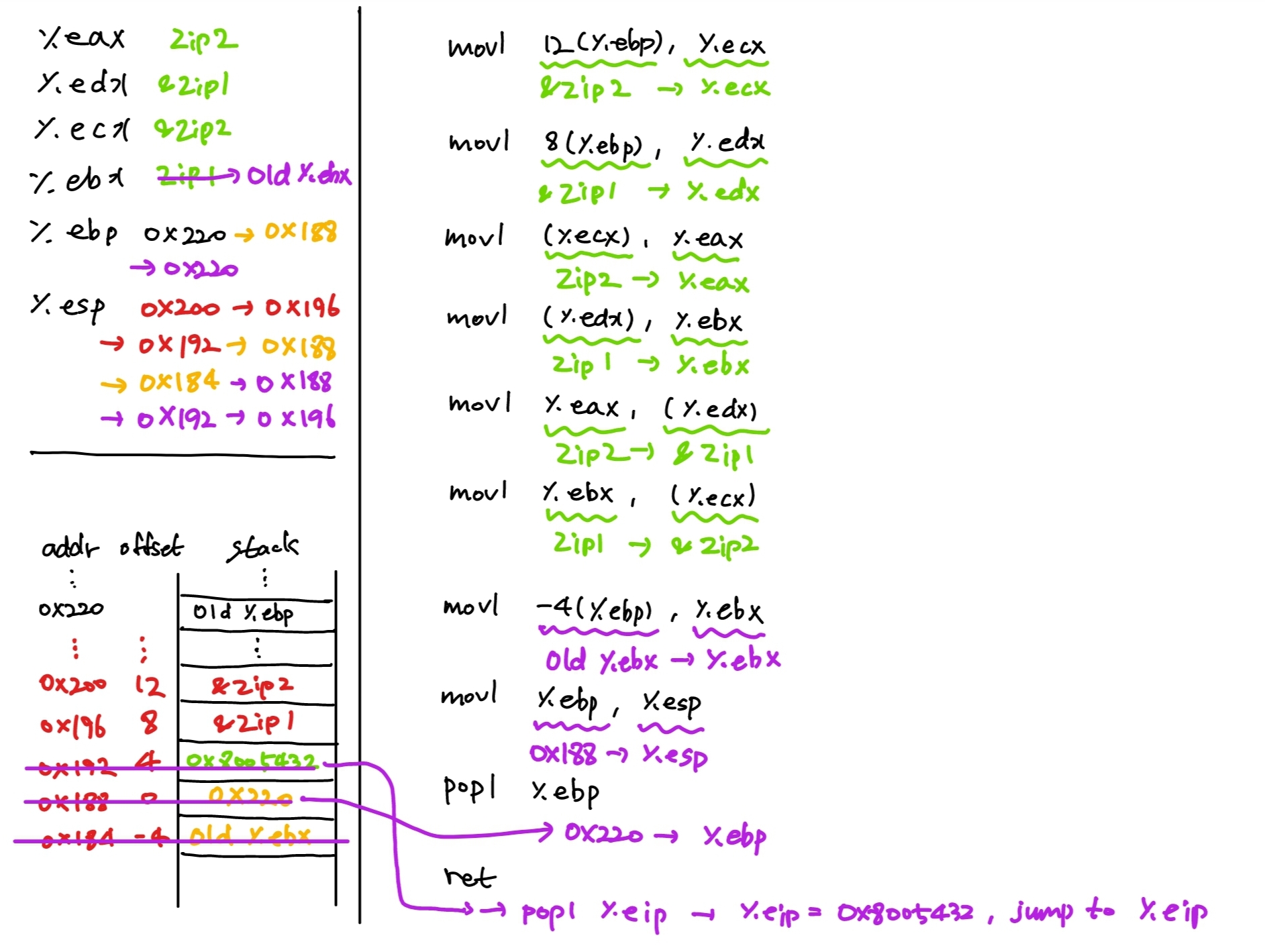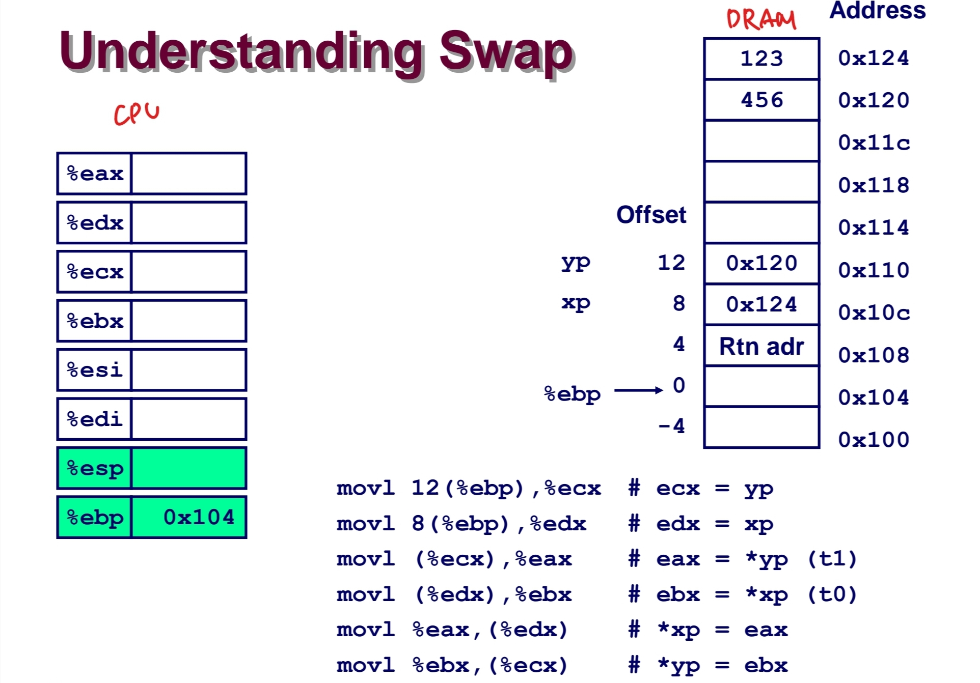 %ebp의 설명이 없었는데, 이 내용을 포함해서 예시를 보며 이해해보자.
