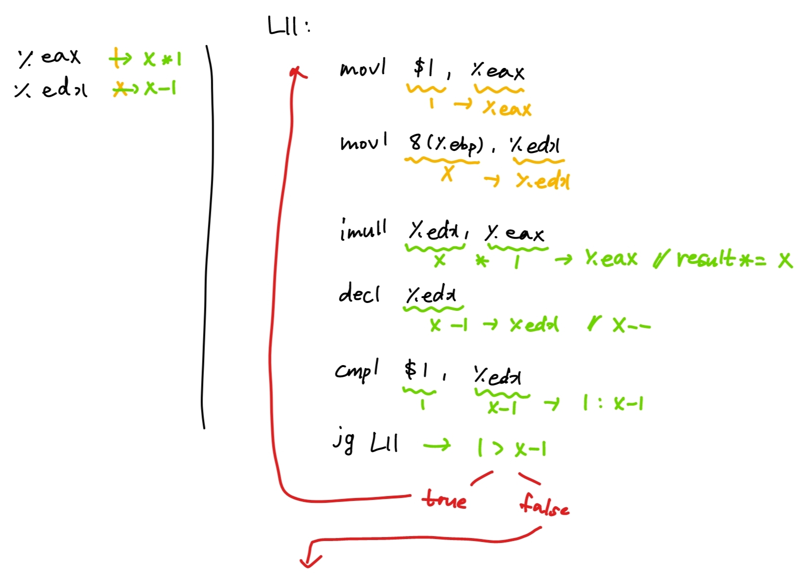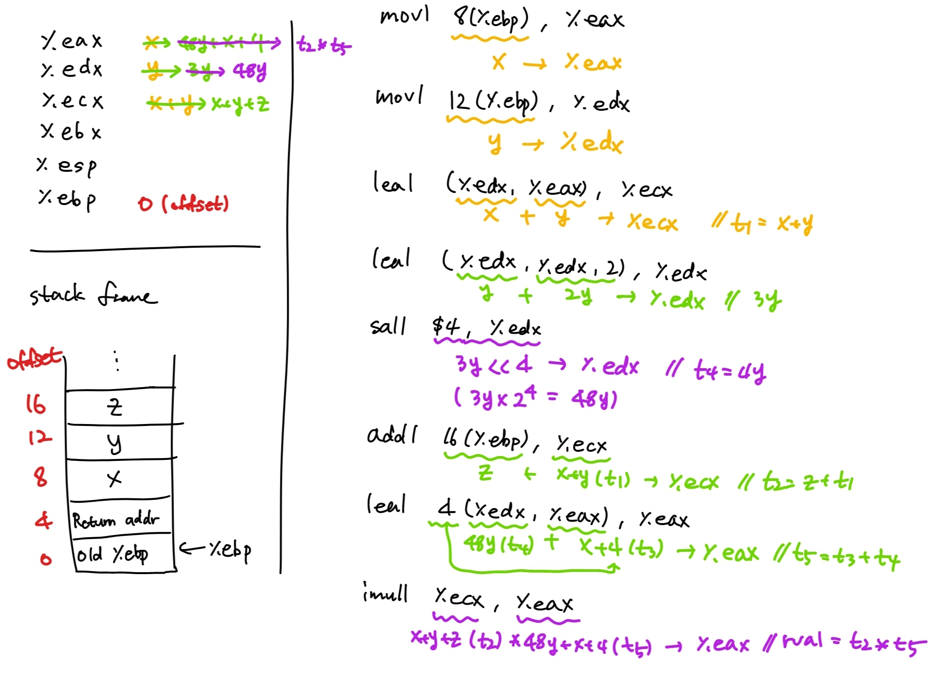 위 c코드를 어셈블리로 변환 후 body부분만 가져오면 아래와 같아진다.