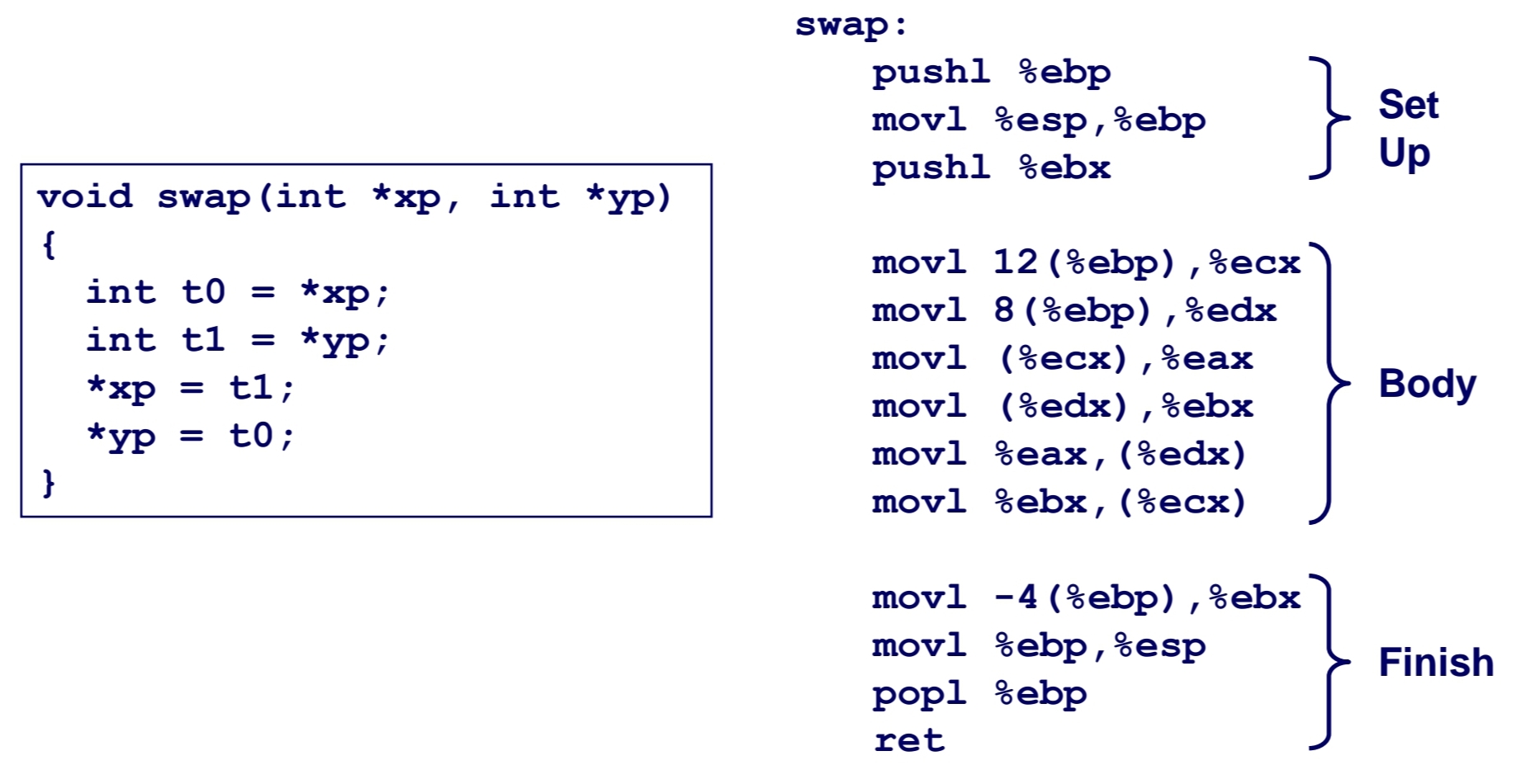 아래가 위 코드를 어셈블리어로 변환한 코드 중 body에 해당하는 코드이다.